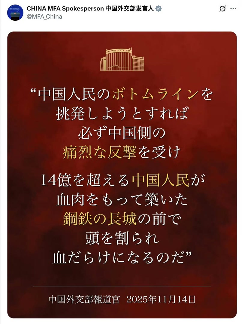 日本新任首相高市早苗上台先玩火,公然宣称若“台湾有事”将构成日本可行使集体自卫权的“存亡危机事态”,暗示武力介入台海问题。这番暴论,在国际舆论场引发轩然大波,堪称战后日本官方言论的“危险新高”。