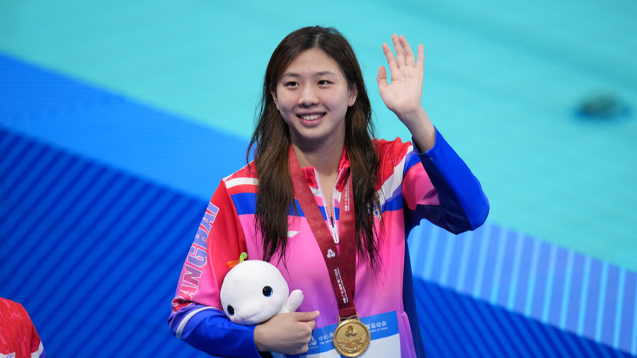 新华社照片,深圳(广东),2025年11月17日\n 11月17日,冠军上海队选手唐钱婷在颁奖仪式后向观众致意。\n 当日,第十五届全国运动会游泳女子50米蛙泳决赛在广东省深圳市举行。\n 新华社记者 丁增尼达 摄