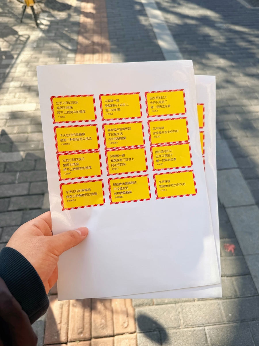 因为担心雨水淋湿这些不干胶,可能会给骑车人带去不便,张馨月特意选了防水的材料纸打印。风一吹,车铃轻轻响,那些带着温度的文字,在冬日的街头闪亮。贴的时候张馨月很担心路人把她当作贴小广告的,心里很忐忑。但有路人停下脚步,看完贴纸的文字后,对着车身上的贴纸掏出手机拍照;有放学的孩子拉着家长的手,指着贴纸念出上面的句子,家长笑着摸了摸孩子的头;还有一位阿姨路过时,盯着贴纸看了好一会儿,转头对张馨月说了句:“姑娘,你这做得真好啊。”张馨月笑着摆摆手,看着来来往往的人因这些小字驻足,心里忽然觉得,这大概就是书里说的“暖一点”的意义。