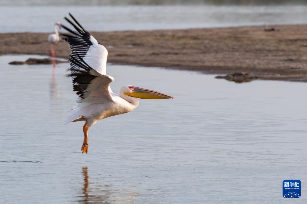 1月8日,在肯尼亚卡贾多郡,一只鹈鹕飞过安博塞利湖湖面。
