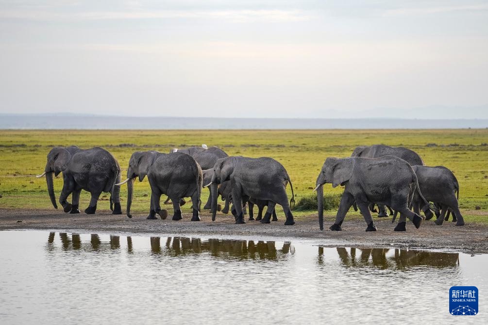 1月8日,在肯尼亚卡贾多郡,非洲象群走过安博塞利湖湖畔。新华社记者 谢剑飞 摄