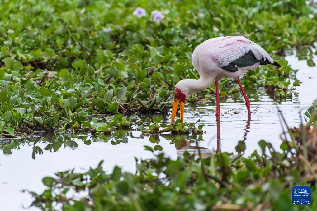 2月1日,在肯尼亚纳库鲁郡,一只黄嘴鹳在奈瓦沙湖觅食。新华社记者 谢剑飞 摄