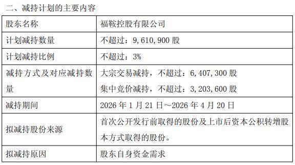 12月26日,福鞍股份(603315.SH)公布,公司控股股东福鞍控股有限公司基于股东自身资金需求,计划自2026年1月21日起至2026年4月20日止,通过集中竞价和大宗交易方式合计减持公司股份不超过961.09万股,即不超过公司总股本的3%。其中,通过大宗交易方式减持不超过640.73万股,通过集中竞价交易方式减持不超过320.36万股。本次减持不设价格区间。
