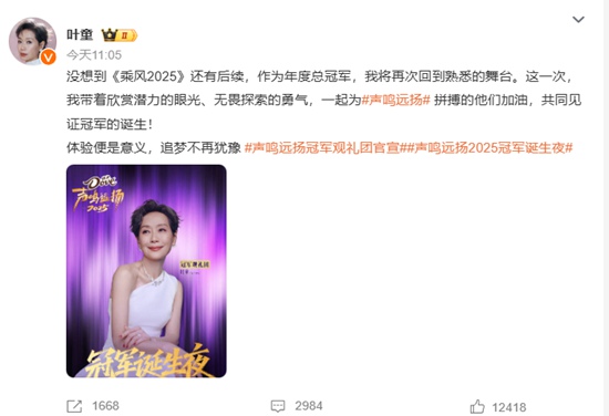 在官宣微博中,叶童分享了此次回归的心境与使命,字里行间满是对舞台的热忱:“带着欣赏潜力的眼光、无畏探索的勇气,为#声鸣远扬#选手加油,见证新冠军诞生。” 她更以“体验便是意义,追梦不再犹豫”这句感言收尾,既呼应了自己在《乘风2025》的拼搏历程,也传递出历经岁月沉淀后的通透与洒脱。此次她将作为重量级嘉宾,参与1月25日19:30的冠军见证环节,与蔡国庆、2024年《乘风》冠军陈昊宇等人组成观礼团,跨圈层、跨季别的嘉宾阵容,让这场冠军诞生夜更添看点。