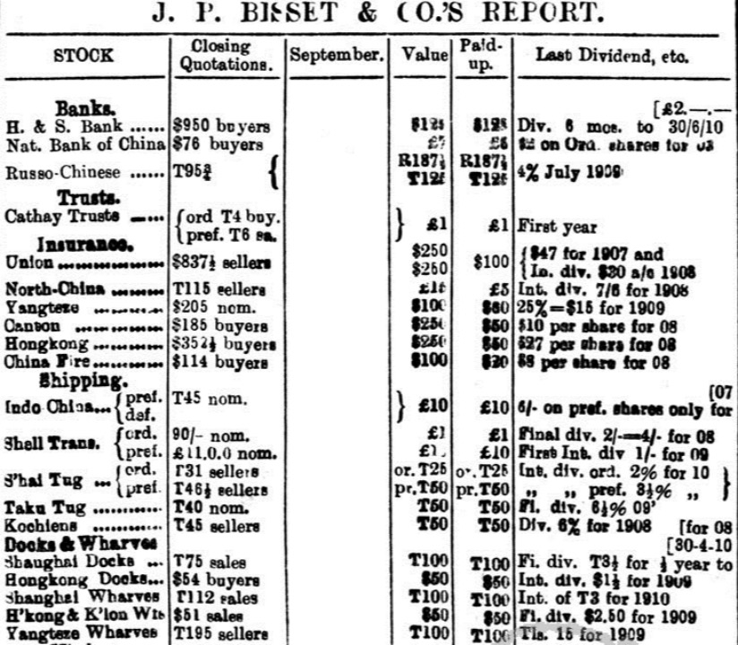 股份行情(1910年9月13日)