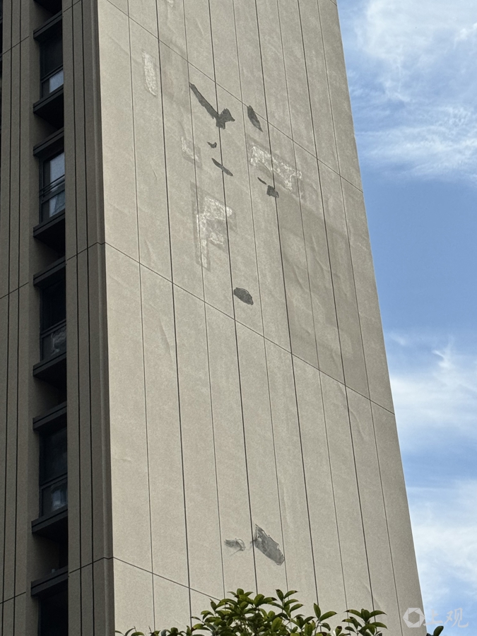 “这房子是阿拉两三代人所有的积蓄啊,还不到一年竟成了这个样子,想想就整夜整夜睏勿着觉。”业主郭先生告诉记者,去年12月预看房时,8号楼外墙就有几个拳头大小的小鼓包,开发商承诺“收房后就修”。由于孩子要赶在今年9月上附近幼儿园,急需装修入住,他便相信了开发商的说法。没想到今年4月起,小鼓包开始“爆雷”:漆面先开裂,随后墙皮碎块不断脱落。直至7月,5号楼外墙已脱落近五分之二,连廊道玻璃顶棚上都溅有不少坠落碎块。其间,开发商进行了两次局部点修,问题却愈演愈烈。没修的地方鼓包扩大,修过的地方又重新开裂,这根本就是“狗皮膏药”式维修,糊弄人的!